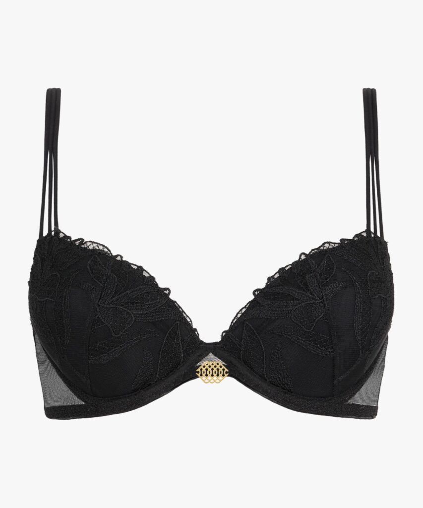 Designed for seduction and comfort, this line plays with the transparency of delicate tulle, while triple straps add