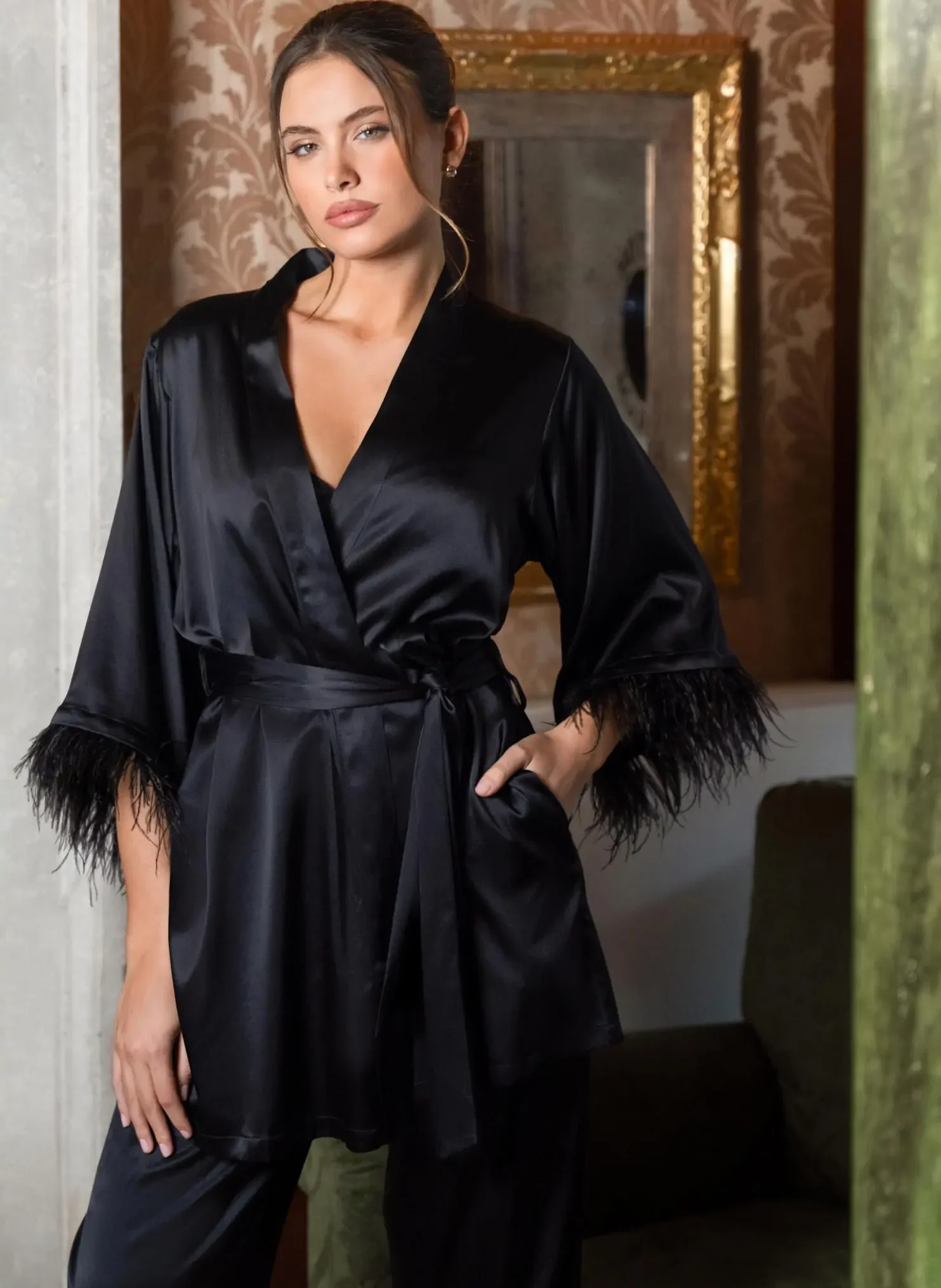 Marc André art. Tenderly Yours lühike siidist kimono eemaldatavate sulekestega EU36